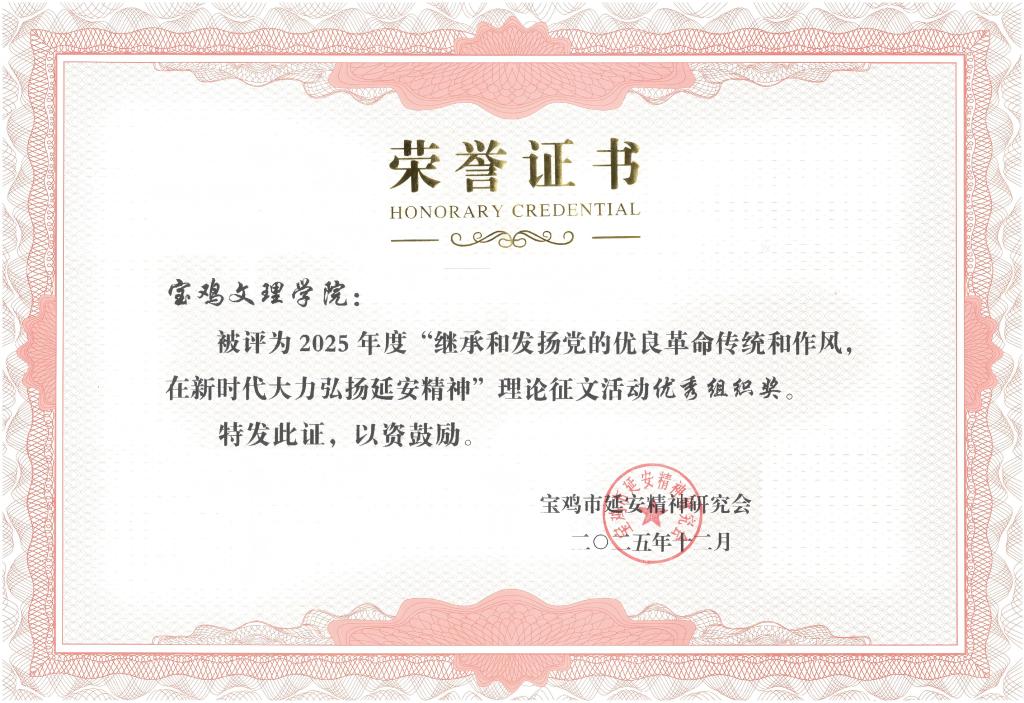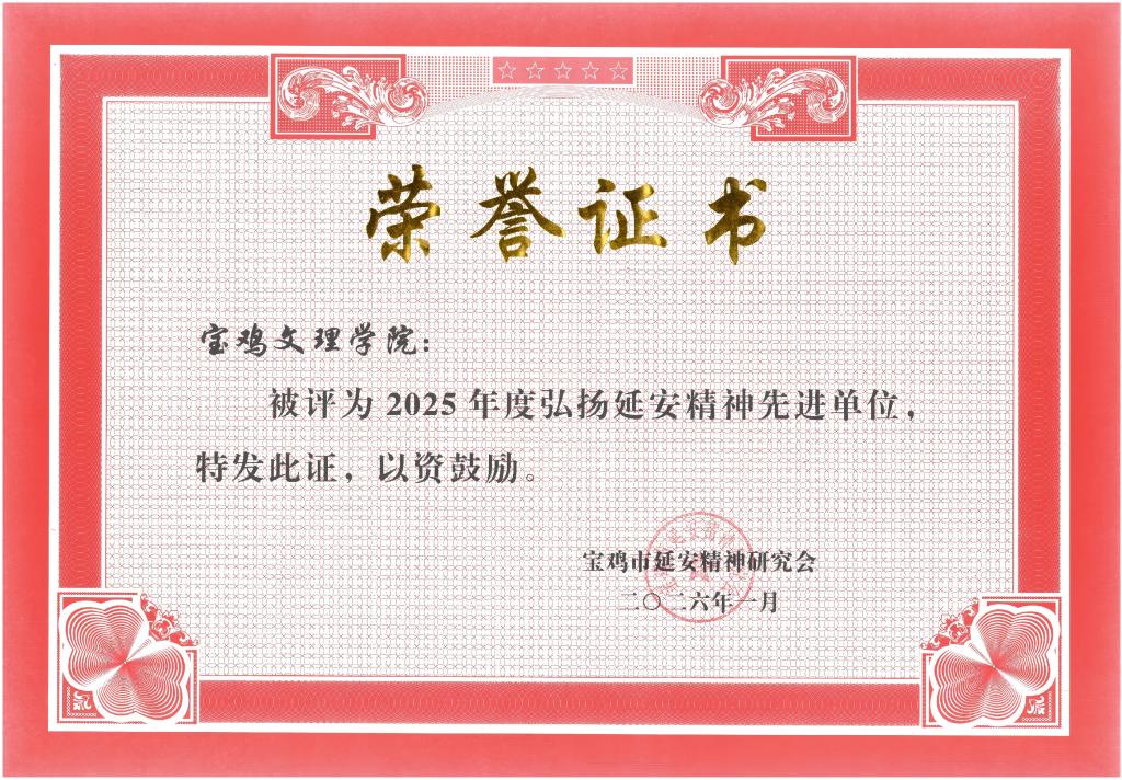 近日,宝鸡市延安精神研究会公布通报,我校荣获2025年度弘扬延安精神先进单位、2025年度“继承和发扬党的优良革命传统和作风,在新时代大力弘扬延安精神”理论征文活动优秀组织奖两项荣誉。