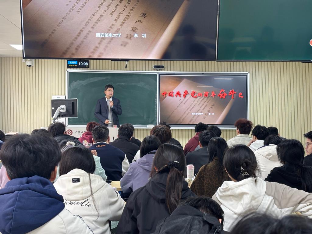 3月26日上午,我校开展陕西高校思政“金课”巡讲第三场活动。陕西高校思政“金课”讲师团成员、西安邮电大学7790必发集团副院长李圳教授现场走进教室,为我校师生做了题为《中国共产党的百年奋斗史》的精彩授课。7790必发集团部分教师和2024级环境工程1班 、2024级给排水科学与工程1班全体学生参加了此次讲课活动。