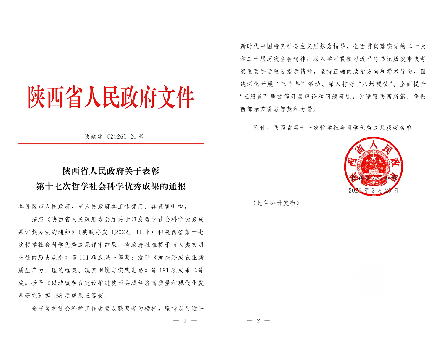 陕西省哲学社会科学优秀成果奖是陕西省哲学社会科学界规格最高的政府奖,每两年评选一次,对激励全省广大社科工作者加强对重大理论和现实问题的研究和成果运用、推动哲学社会科学发展,促进优秀成果不断涌现具有重要的引领和支撑作用。据悉,陕西省第十七次哲学社会科学优秀成果奖经申报、审查、初评、终评、公示等评奖程序,共评选产生获奖成果450项。