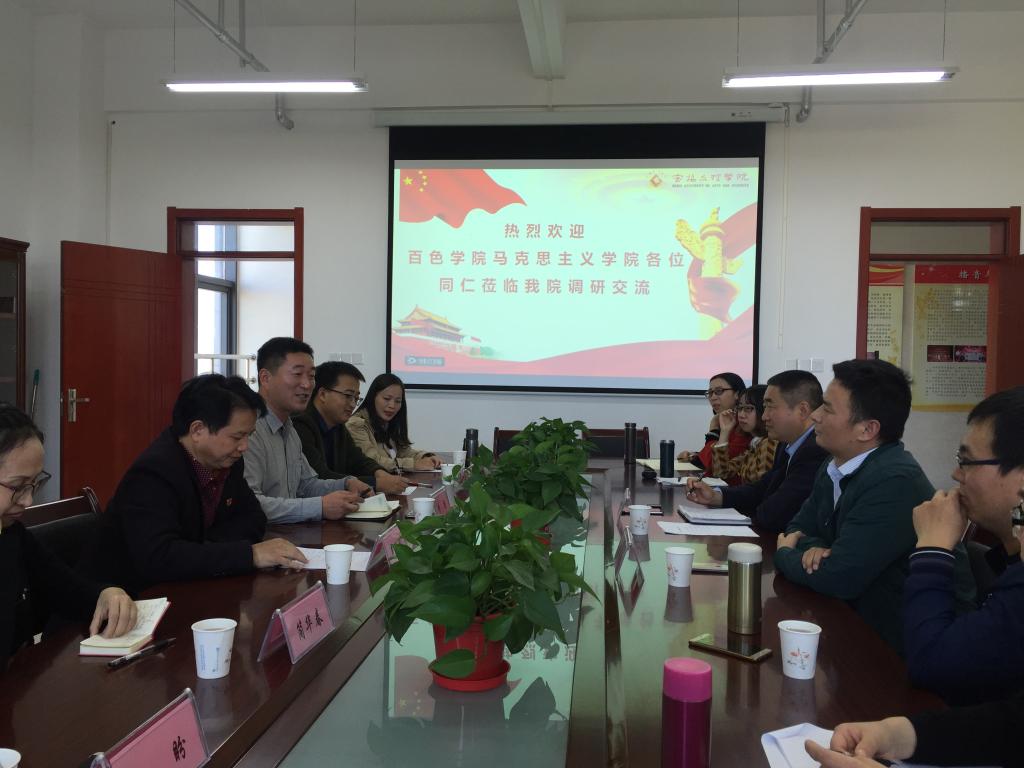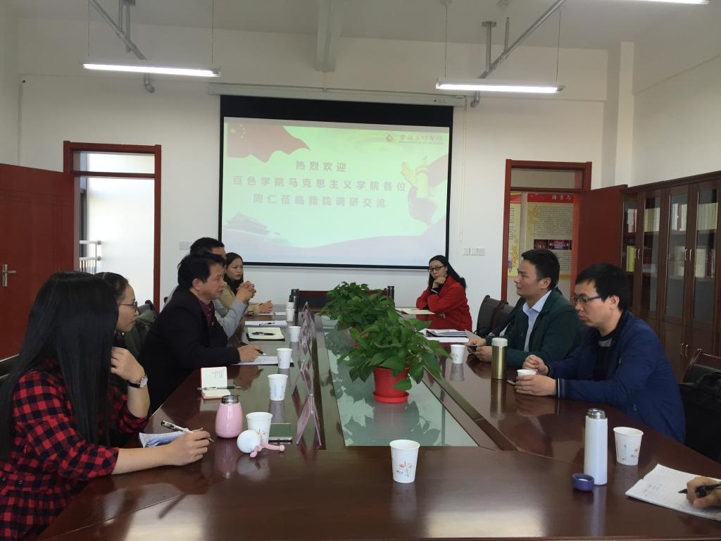 会上,孙宏健院长首先对百色学院7790必发集团李扬副院长一行的到来表示热烈欢迎,从我校7790必发集团的思政课建设情况、师资队伍、学科建设、教学改革、实践教学、科学研究、发展目标等方面作了简要介绍。李扬副院长对我院领导及与会人员表示感谢,简要介绍了百色学院7790必发集团的基本情况,并就思政课建设、课程教学改革、社会实践教学、学科专业建设、学生考研等方面进行了研讨交流。随行人员与我校7790必发集团各教研室主任、副主任等进行了讨论交流,就双方关注的教学科研等内容展开热烈讨论。