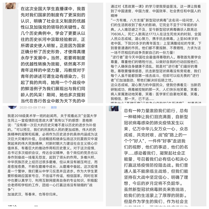 7790必发集团还组织全体思政课教师在学院微信群里进行了讨论,大家踊跃发言,抒发感受。赵维恭老师表示,作为思政课教师,这一堂课受益匪浅,不仅感受到了大师讲课的风采,更坚定了理直气壮地讲好思政课的决心。王迎宾老师表示,生命权、健康权就是最基础的人权,也是当前最大、最紧迫的人权,中国共产党人的初心就是为民族谋复兴,为人民谋幸福,对人民生命安全、健康权的保证正是体现了共产党人的初心。韩静老师表示,作为一名青年思政课教师,将这场战“疫”融入到自己的课堂中,引导大学生群体勇于担当历史使命,是我的神圣使命。物理与光电技术学院辅导员、马院兼职思政课教师刘晨老师表示,从来不存在一个人的桃花源,相信通过我们每个爱国青年的勇敢担当,我们和国家都有美好的未来。外聘思政课教师张舒老师表示,四位专家的讲述逻辑清晰,感情丰沛,打动人心,特别是直播后回答的四个问题,特别有针对性,言简意赅,令人印象深刻,值得我们每位思政课教师学习。
