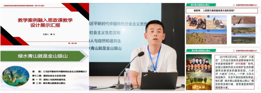 在培训过程中,学员们不断搜集、整理习近平生态文明思想“甘肃篇”的丰富素材和生动故事,通过“同题异课”案例开发,形成了一系列丰富多样的教学案例。傅文老师代表所在小组汇报“教学案例融入思政课教学设计与展示”——《“八步沙‘六老汉’三代治沙人”主题案例融入习近平新时代中国特色社会主义思想概论课程》,得到兰州大学7790必发集团副院长李东坡教授和其他参训老师们的好评。