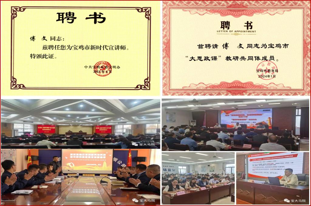 近年来,傅文先后受聘宝鸡市委讲师团成员、宝鸡市新时代宣讲师、宝鸡市“大思政课”教研共同体成员、宝鸡市党史专家库成员,用自己的科研与教学成果服务社会。随着宣讲水平的不断提高和社会知名度的不断上升,他多次受邀走进政府机关、企事业单位和军队系统,向全市党员干部群众宣讲党的十九届六中全会精神、习近平总书记“七一”讲话精神、习近平总书记来陕重要讲话重要指示精神、党的二十大精神、党纪学习教育、党的二十届三中全会精神等。他认为,理论宣讲是对思政教师教学水平和科研水平的最好检验,精彩的理论宣讲一定会反哺思政课教师的教学和科研。