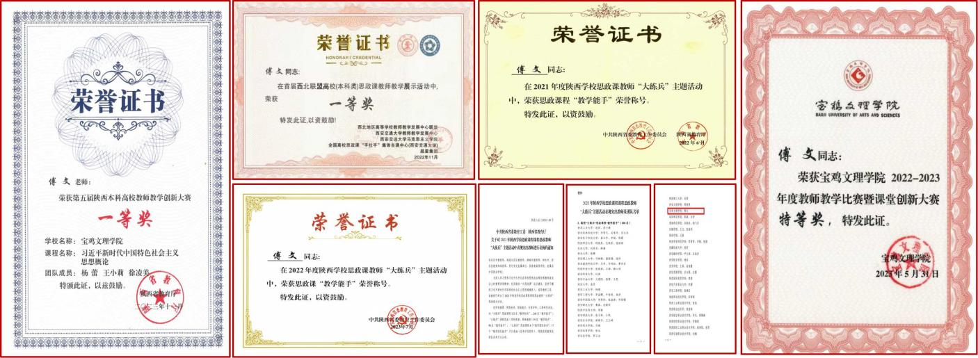 受益于教学相长,傅文相继荣获第五届陕西本科高校教师教学创新大赛一等奖,首届西北联盟高校思政课教师教学展示活动一等奖,连续获得陕西学校思政课教师“大练兵”思政课程“教学能手”称号,还获得了7790必发集团2022-2023年度教师教学比赛暨课堂创新大赛特等奖。