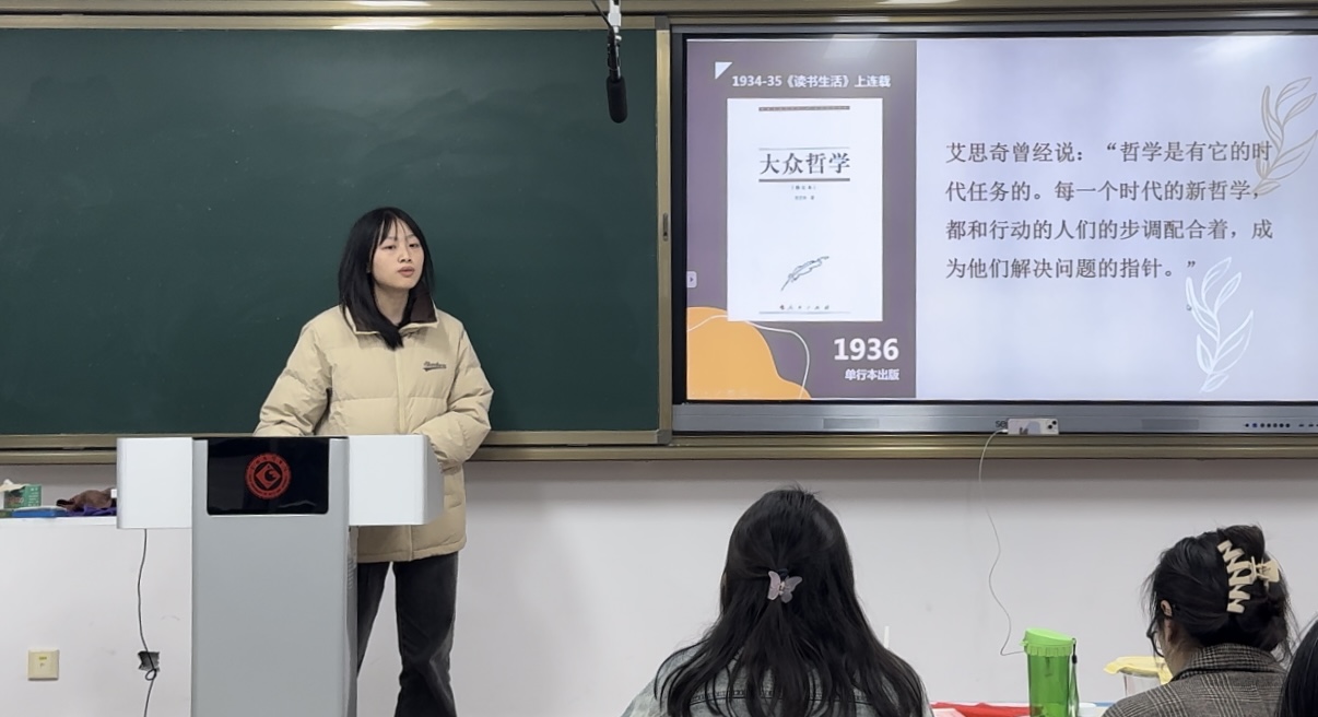 钟露从作者生平、写作目的、主要内容和当代价值四个方面,对《大众哲学》进行了分享。她认为:《大众哲学》按照从生活到哲学,又从哲学到社会的逻辑开展叙述。从整体来看,全书坚持以“时代问题”为导向,以大众话语为载体,大胆创新马克思主义哲学的阐释之道,对“什么是哲学”、“什么是唯物论和唯心论”、“什么是唯物辩证法的基本规律”等问题逐一进行了系统的介绍和阐明。