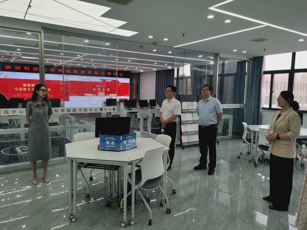 调研期间,调研组实地参观了陕西科技大学网络思想政治工作中心,学习“一轴两极三驱动”网络育人模式。该模式紧紧围绕立德树人根本任务,把握坚持用习近平新时代中国特色社会主义思想铸魂育人,将思政元素贯穿学生教育管理服务全过程“一轴”,推动教师主体和学生主体“两极”协同,聚焦精准化技术赋能、品牌化内容培育、系统化科学研究“三驱动”,实现网络育人的“软着陆”。