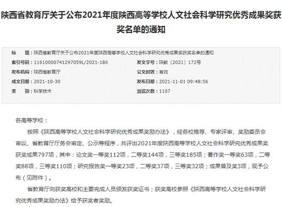 2021年10月30日,陕西省教育厅公布了2021年度陕西高等学校人文社会科学研究优秀成果奖获奖名单。