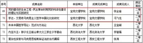 我院张全省教授所著的《党的建设的生命工程——民主革命时期党的纯洁性建设的理论与实践研究》及冯飞龙教授所著的《李达、艾思奇马克思主义哲学中国化比较研究》,获著作类二等奖。