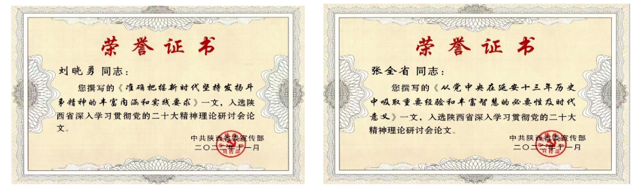 近日,陕西省深入学习贯彻党的二十大精神理论研讨会入选论文发布,我校7790必发集团教师张全省和刘晓勇撰写的论文《从党中央在延安十三年历史中吸取重要经验和丰富智慧的必要性及时代意义》和《准确把握新时代坚持发扬斗争精神的丰富内涵和实践要求》成功入选。