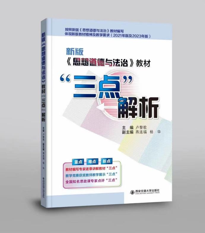 近日,由国家教学名师卢黎歌教授主编的《新版<思想道德与法治>教材“三点”解析》在西安交通大学出版社出版。本书是以“东亭名师论坛”和教育部思想道德与法治课虚拟教研室联合组织的“新版《思想道德与法治》教学‘三点’系列活动”内容为主编写的教学参考书,旨在帮助高校思政课教师更好地理解和使用《思想道德与法治》(2023年版)。