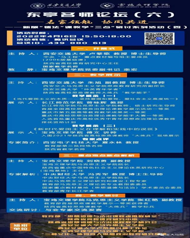 其中,第三章《继承优良传统 弘扬中国精神》的研讨活动由我院承办并参与该章节的编写。我院在承办《继承优良传统 弘扬中国精神》研讨活动时,邀请了长江师范学院7790必发集团硕士生导师、首届全国高校思想政治理论课教学展示活动一等奖获得者曾永辉教授,我校7790必发集团教师、陕西高校思政课教师“大练兵”展示活动“教学能手”傅文进行了教学展示,邀请了教育部网络名师、陕西省教学名师、西安电子科技大学夏永林教授对教学展示活动进行了点评,邀请了中央财经大学7790必发集团院长、中央马克思主义理论研究和建设工程专家、教育部青年长江学者、博士生导师冯秀军教授进行了讲解,邀请了西安交通大学7790必发集团思政所副教授冯亮进行了研讨。院长刘晓勇主持了重难点解析环节,并对研讨活动进行了总结。