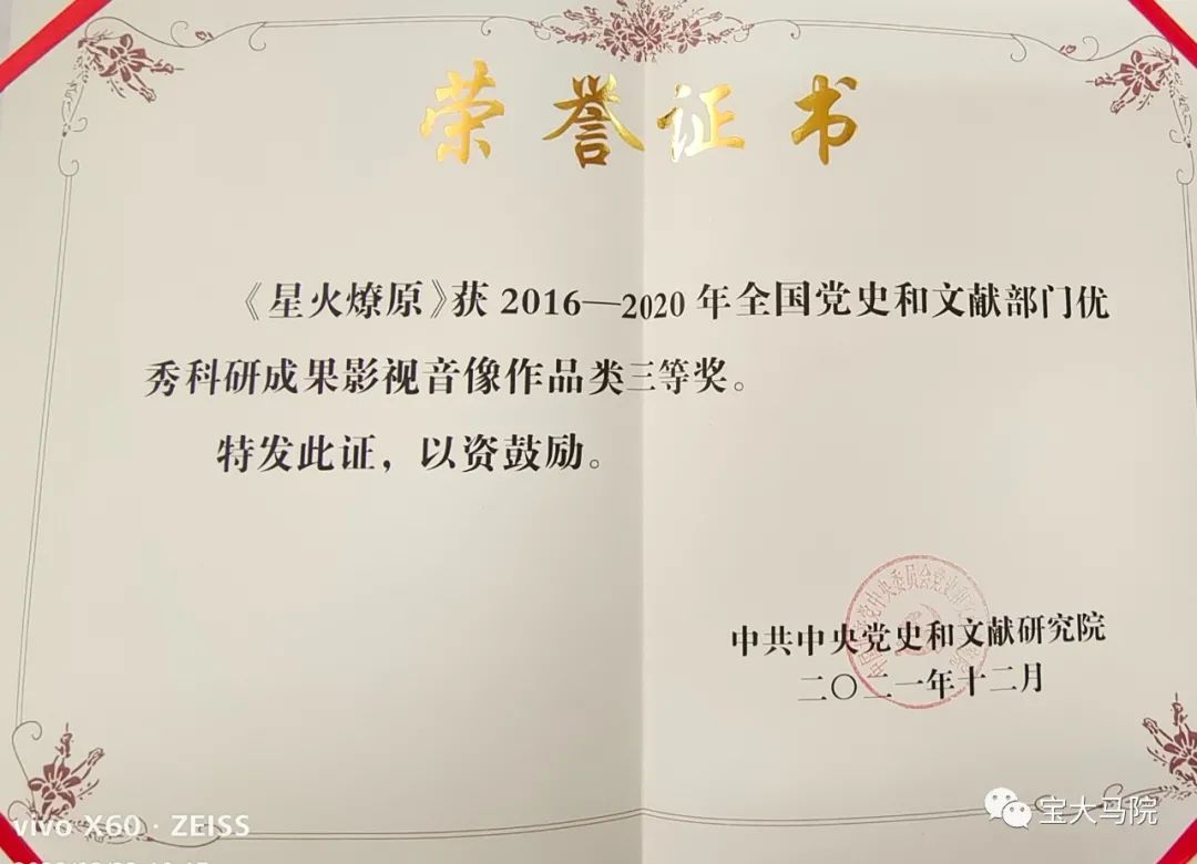 近日,全国党史和文献部门主要负责人会议以视频形式召开,会议表彰了2016—2020年全国党史和文献部门先进集体、先进个人和优秀科研成果。由中共宝鸡市委党史研究室联合宝鸡市教育局共同制作,由我校7790必发集团院长刘晓勇和麟游县委常委、县纪委书记、县监委主任上官青云担任编剧的五集地方党史影片《星火燎原》荣获“2016—2020年全国党史和文献部门优秀科研成果影视音像作品类三等奖”。这是近年来宝鸡党史研究成果获得的最高奖项。