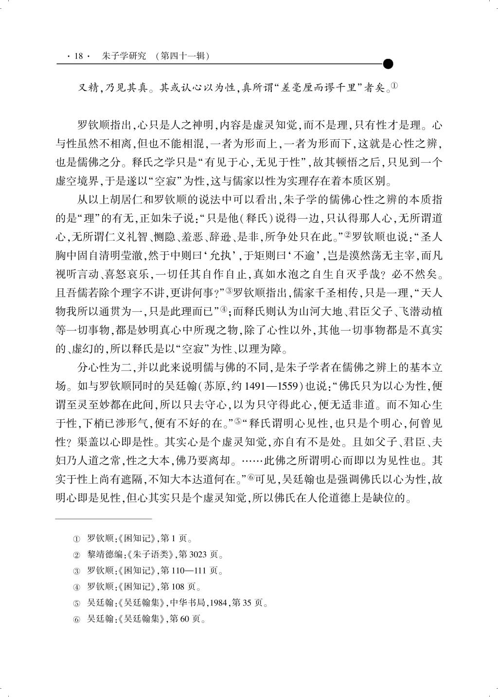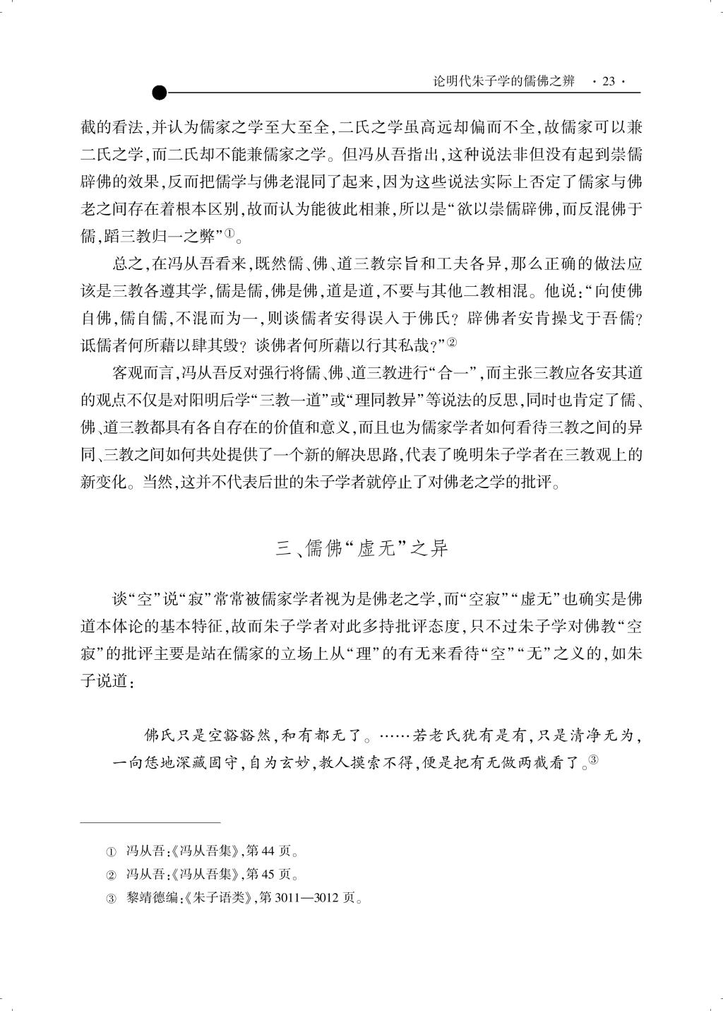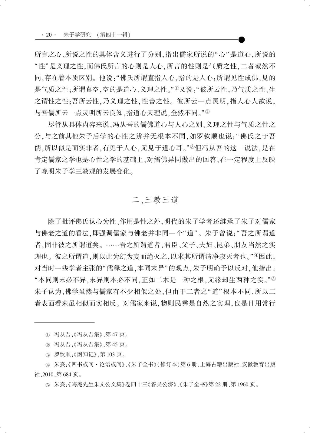 文章从心性之分、三教三道、儒佛“虚无”之异三个方面对于儒家与佛氏的思想进行辨析,指出明代朱子学者的儒佛之辨,其主要观点基本上是继承自朱子,体现了朱子学在三教异同这一问题上所具有的相对稳定性。不过,随着中晚明阳明学的兴起和三教融合在心性义理上的进一步深入,朱子学者在对儒佛异同的看法上也发生了一些新的变化。