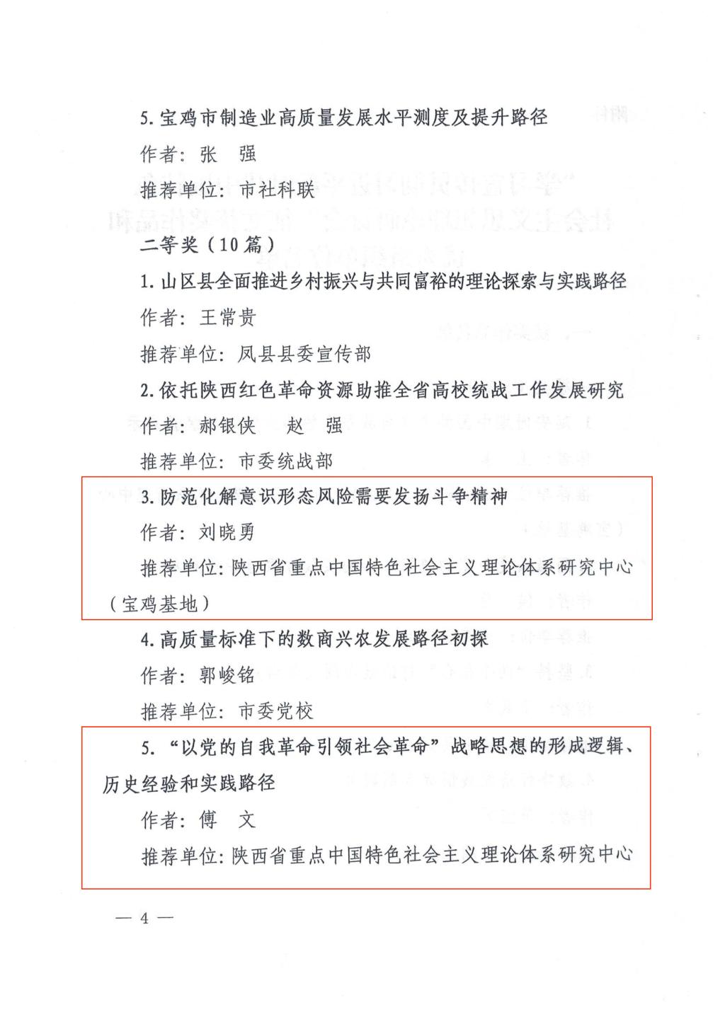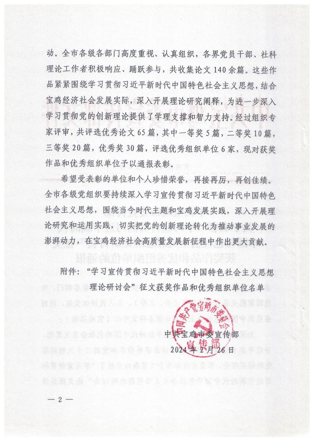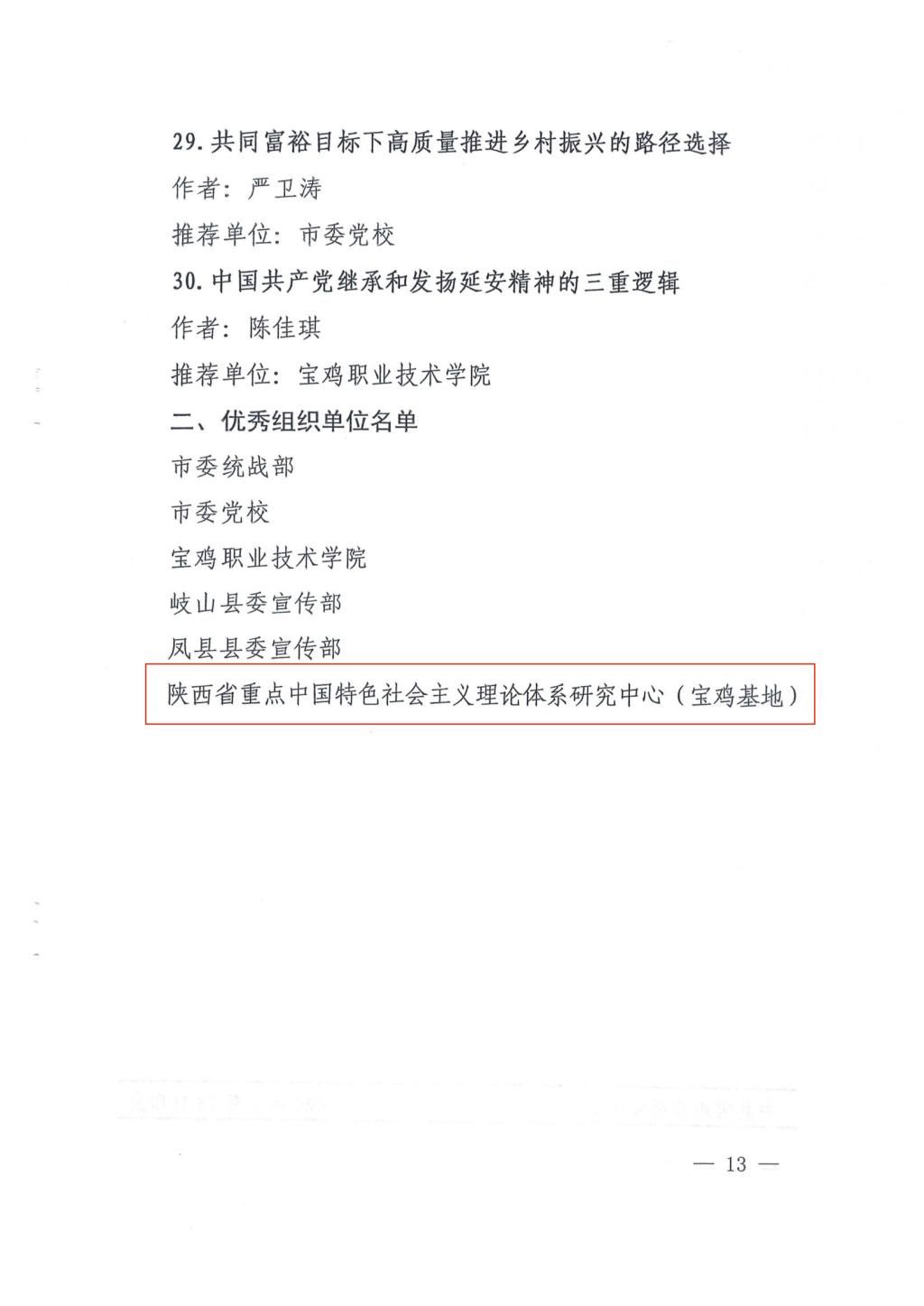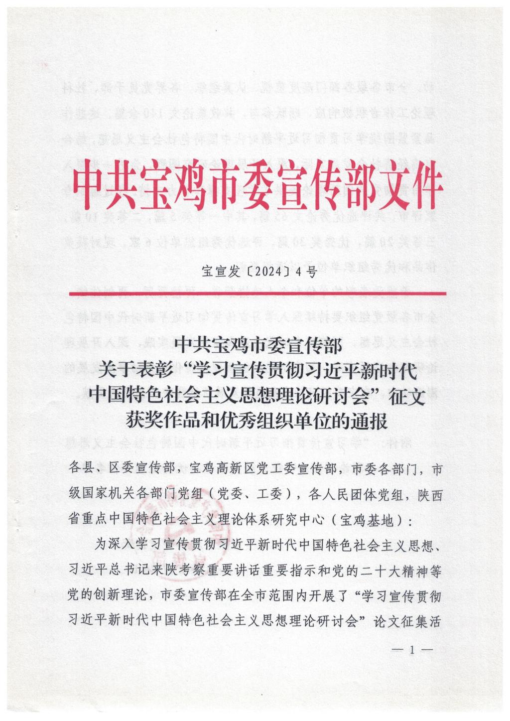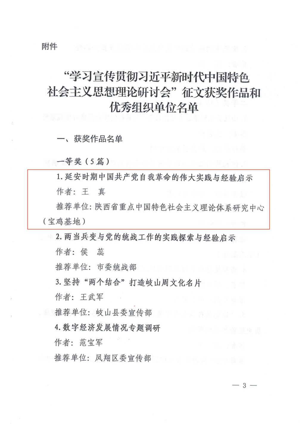 近日,中共宝鸡市委宣传部发布《关于表彰“学习宣传贯彻习近平新时代中国特色社会主义思想理论研讨会”征文获奖作品和优秀组织单位的通报》,我院王真教授的作品《延安时期中国共产党自我革命的伟大实践与经验启示》获得一等奖,刘晓勇教授的作品《防范化解意识形态风险需要发扬斗争精神》、傅文老师的作品《“以党的自我革命引领社会革命”战略思想的形成逻辑、历史经验和实践路径》获得二等奖,韩静博士的作品《中国构建人类命运共同体方案的道路选择、制度优势和文化底蕴》获得三等奖,陕西省重点中国特色社会主义理论体系研究中心(宝鸡基地)获得“优秀组织单位”荣誉称号。