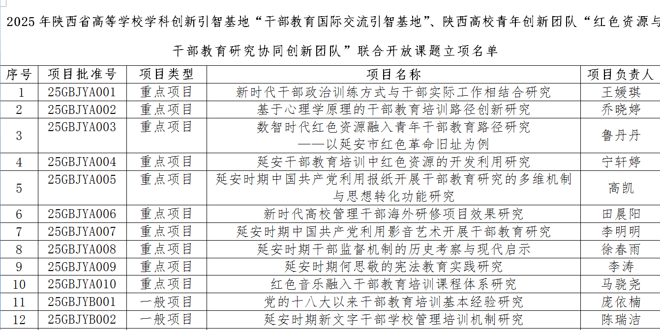 近日,延安大学官网发布了《关于2025年陕西省高等学校学科创新引智基地“干部教育国际交流引智基地”、陕西高校青年创新团队“红色资源与干部教育研究协同创新团队”联合开放课题立项的通知》,我院2024级硕士研究生王媛琪、刘昊团队申报的“新时代干部政治训练方式与干部实际工作相结合研究”课题获准立项。