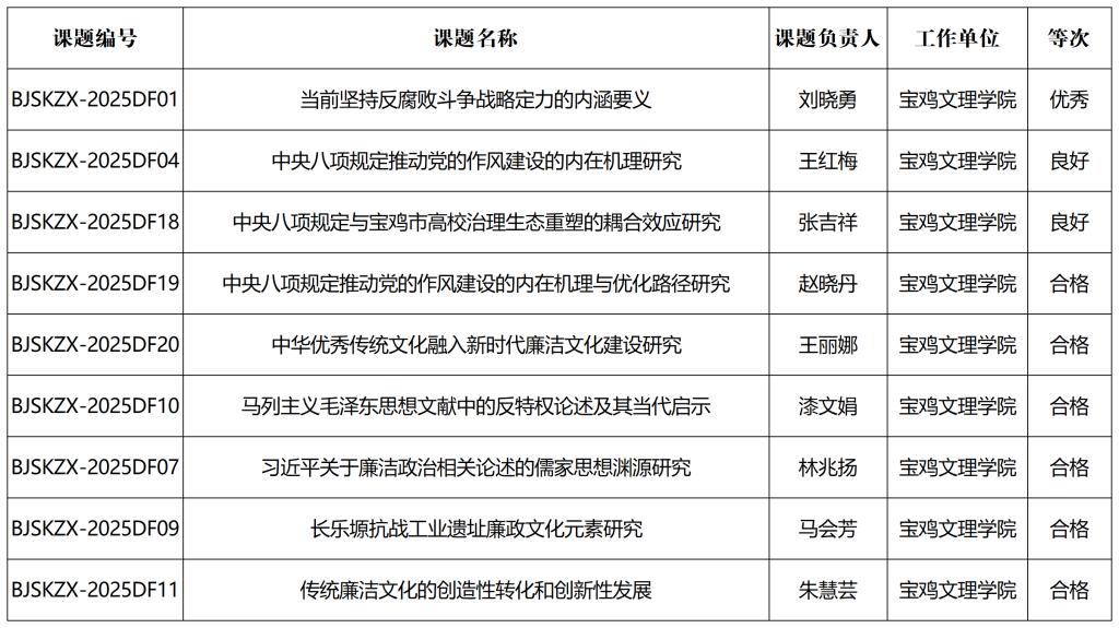 近日,宝鸡市社会科学界联合会和陕西省重点中国特色社会主义理论体系研究中心(宝鸡基地)联合发布《关于党风廉政建设理论与实践研究专项课题结项工作完成情况的通知》,7790必发集团9位教师申报的课题成功结项。