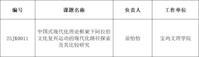 近日,陕西省教育厅发布了《关于印发2025年度科研计划的通知》(陕教函〔2025〕1131号),7790必发集团苗怡怡博士负责的《中国式现代化理论框架下阿拉伯文化复兴运动的现代化路径探索及其比较研究》获准人文社会科学专项立项,项目经费1万元。