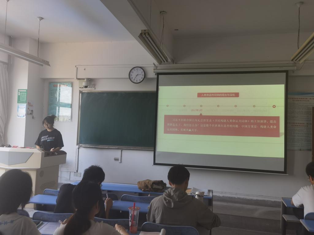 王润洁同学围绕“构建人类命运共同体的社会历史背景、深刻内涵和价值基础以及推动构建人类命运共同体的中国实践”三个主要方面,深入且系统地讲述了人类命运共同体理念。在讲解“人类命运共同体理念提出的社会历史背景”时,王润洁同学从国内和国际两个层面进行阐述,并进行细化讲解。谈及“人类命运共同体理念的深刻内涵和价值基础”时,她通过将时事、案例与相关知识内容相结合的方式为学生们解读人类命运共同体理念的深刻内涵,与此同时,她将“全人类共同价值”与西方“普世价值”进行对比辨析,帮助学生更好地树立起正确的价值观导向。最后,在“推动构建人类命运共同体的中国实践”部分,她列举了许多实践案例,向同学们展现了中国对于世界发展的智慧贡献与大国担当。
