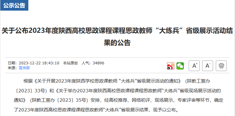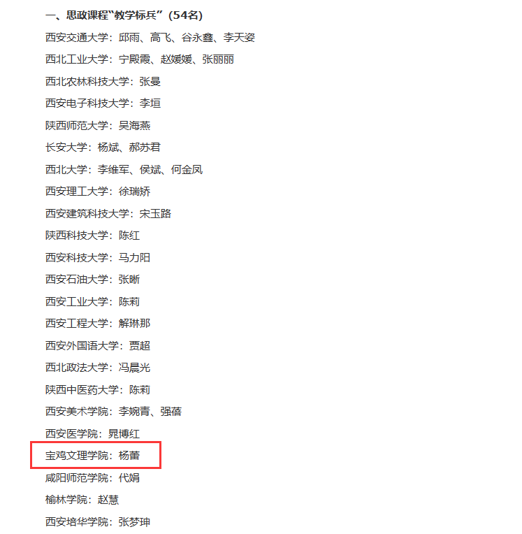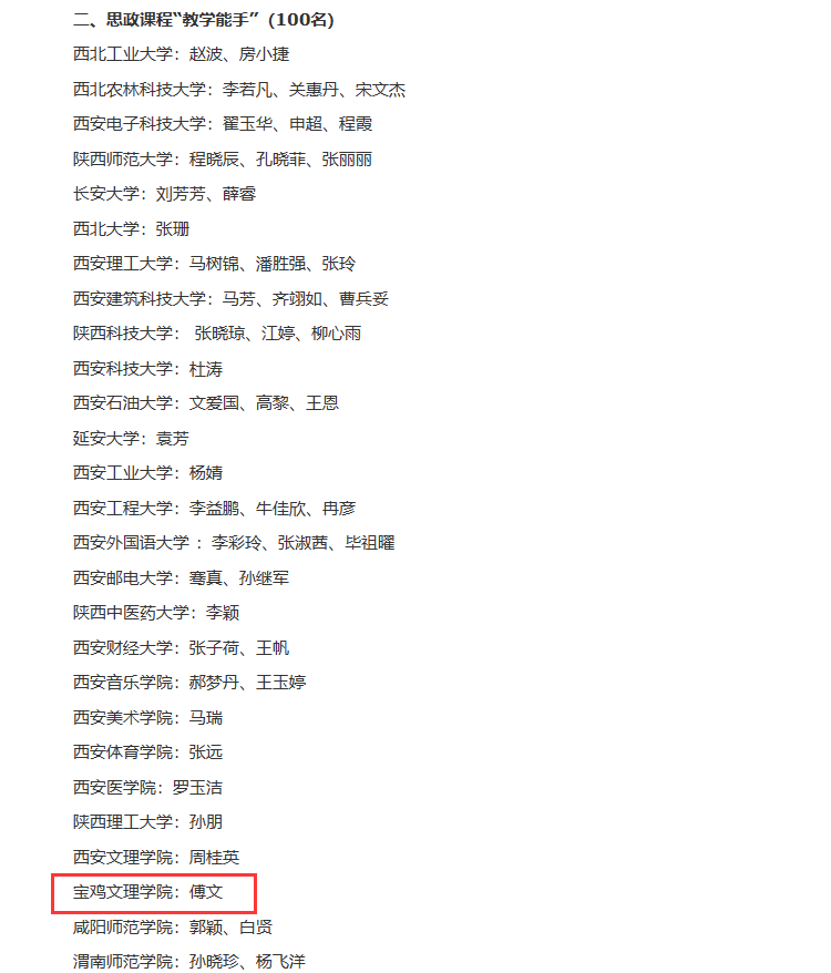 近日,中共陕西省委教育工委发布了《关于公布2023年度陕西高校思政课程课程思政教师“大练兵”省级展示活动结果的公告》,我校7790必发集团杨蕾老师荣获思政课程“教学标兵”荣誉称号,傅文老师荣获思政课程“教学能手”荣誉称号。我校获奖数量持续增长,成绩继续位居全省高校前列。